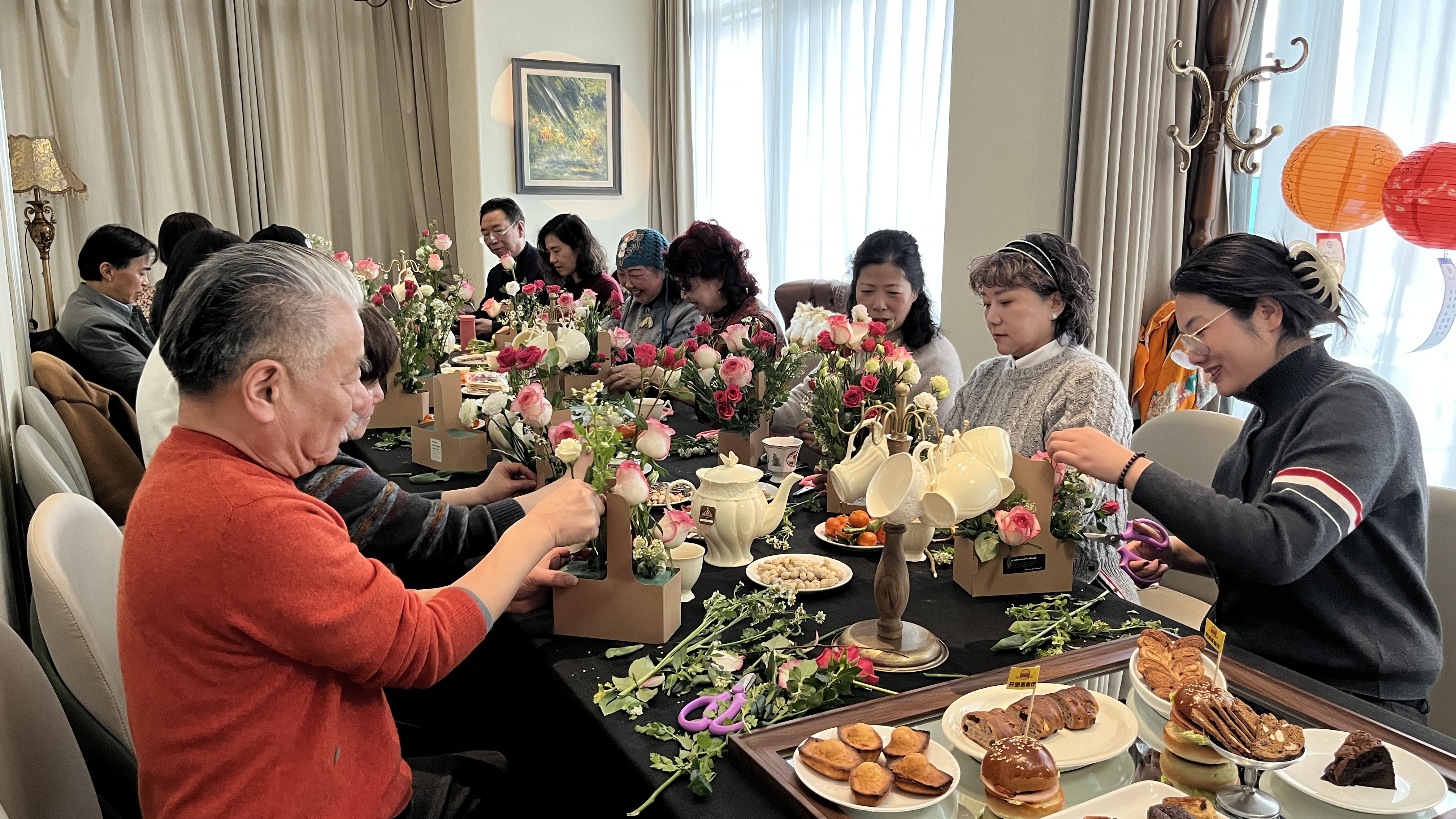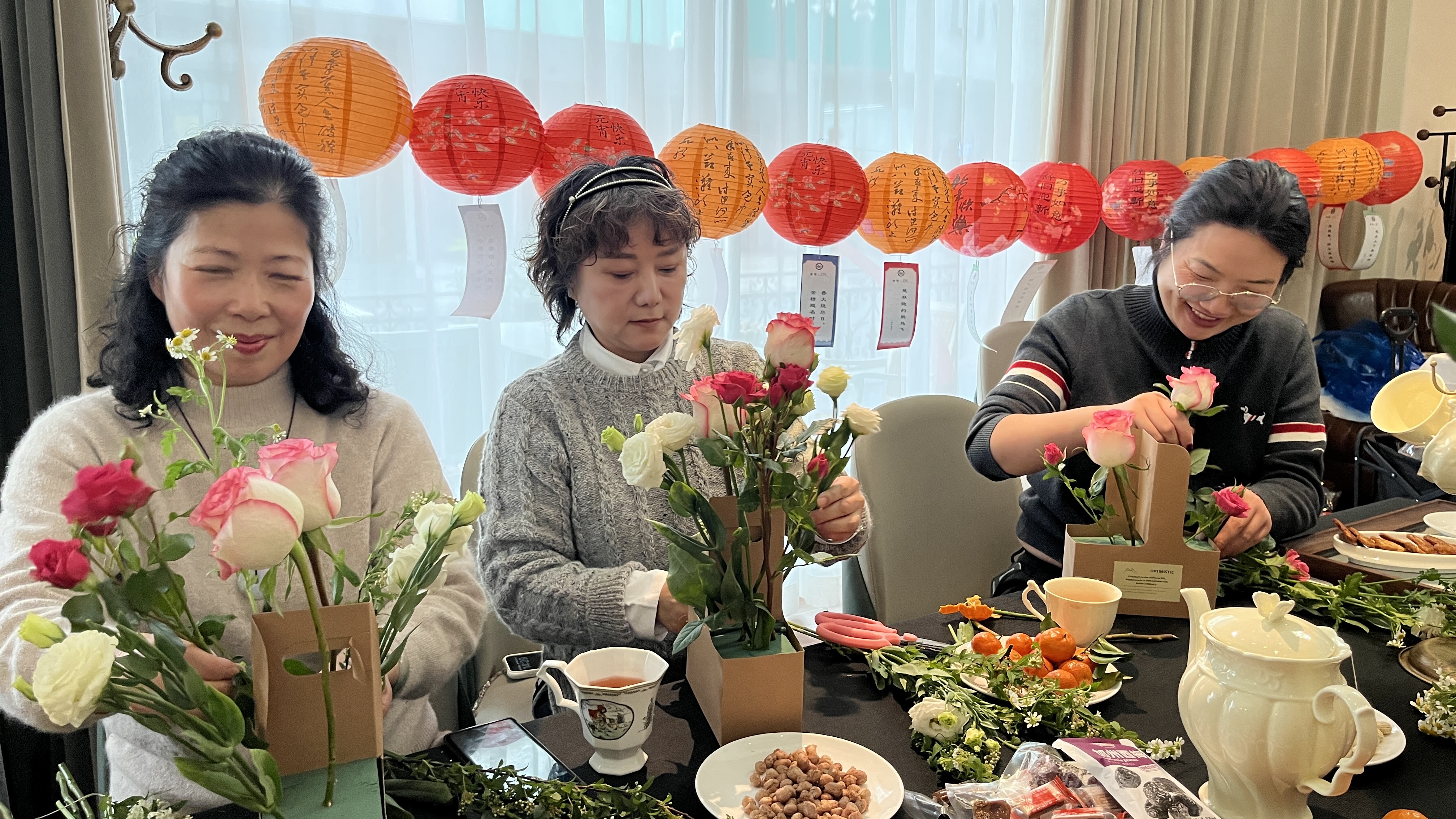 活动特别增设插花雅趣环节,由中国人寿苏州分公司FLP财富中心李大微带领诵友们动手创作,剪枝插瓶、静心布局,以鲜花寄情,以美学养心,在一折一插间体会东方花艺的静美。茶香、书香、花香交织,笑语与欢声相伴,现场气氛轻松融洽、诗意盎然。